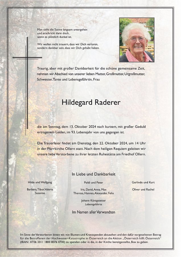 Mit Frau Raderer war es immer ein nettes und ehrliches Gespräch, sie war erfreut wenn wir uns des öfteren in Ollern trafen.